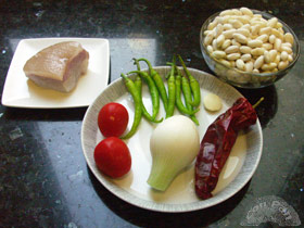 200gr de pochas blancas 2 tomates pequeños 1 cebolleta 1 diente de ajo 1 pimiento choricero 8 guindillas verdes de Ibarra 75 gr de panceta fresca