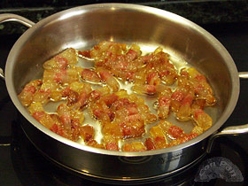 Cortamos la panceta en bastoncitos no muy grandes y la ponemos a que se fría muy suave para que suelte un poco de grasa, la dejamos a fuego suave en lo que preparamos el resto de ingredientes.