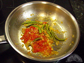 En una sartén ponemos la cebolleta cortada fina a pochar unos diez minutos. a continuación le incorporamos el tomate y las guindillas dejando unos minutos mas.